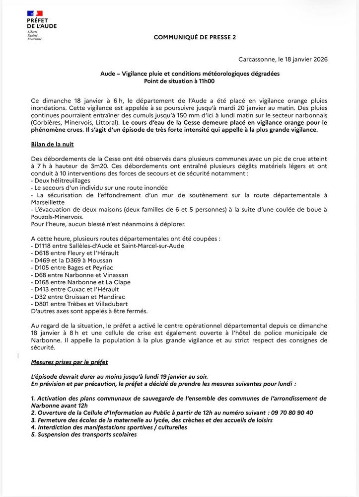 𝗜𝗡𝗙𝗢 𝗩𝗜𝗚𝗜𝗟𝗔𝗡𝗖𝗘 – 𝗜𝗻𝘁𝗲𝗺𝗽𝗲́𝗿𝗶𝗲𝘀 Message de la Préfecture de l’Aude Le département de l’Aude va connaître un épisode de pluies intenses à partir de demain, samedi 17 janvier, et jusqu’au ...