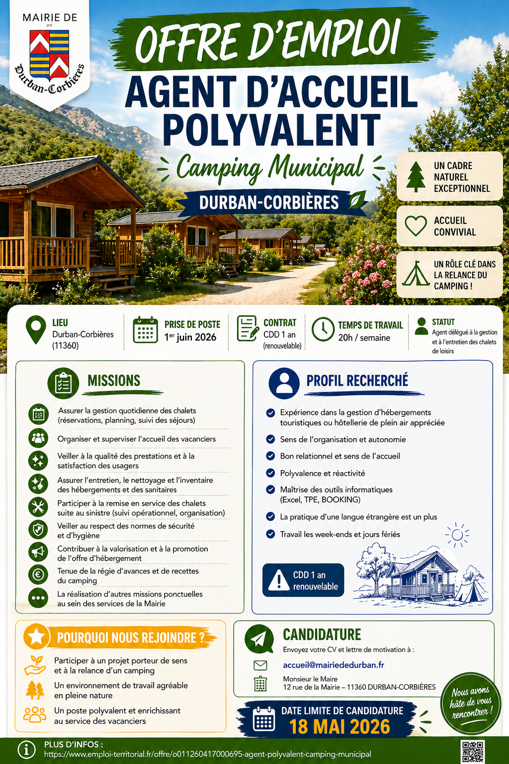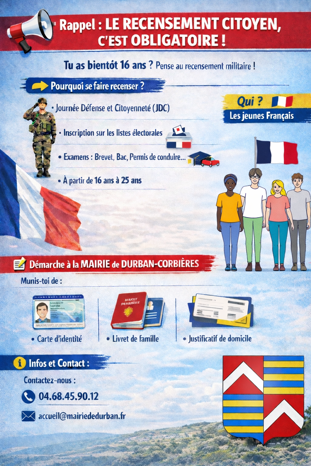 Les inscriptions se font à la mairie de Durban avant le 31 mai 2026. Sont concernés les enfants nés en 2023 (scolarité obligatoire des enfants de 3 ans), ainsi que les enfants récemment arrivés dans les villages de Albas, Cascastel, Durban, Embres, Fontjoncouse, ...
