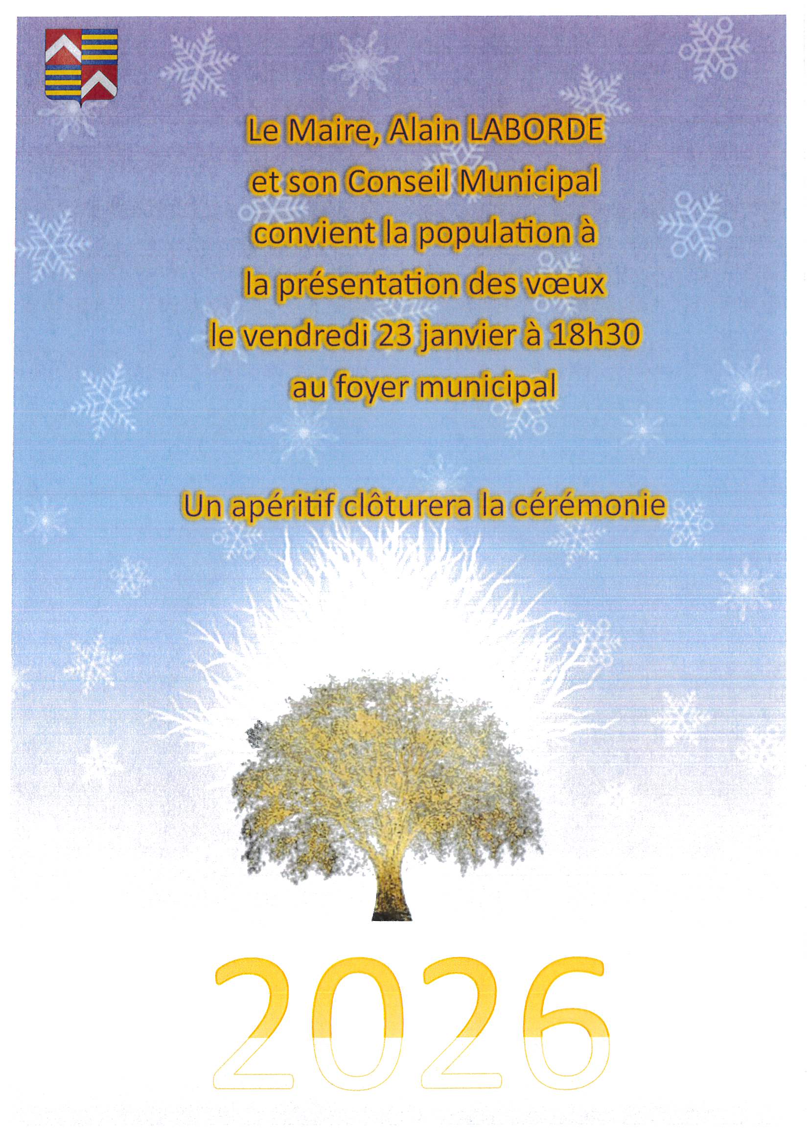 Le Maire et son Conseil Municipal invitent la population à la traditionnelle cérémonie de présentation des vœux qui aura lieu vendredi 23 janvier 2026 à 18h30 au Foyer Municipal