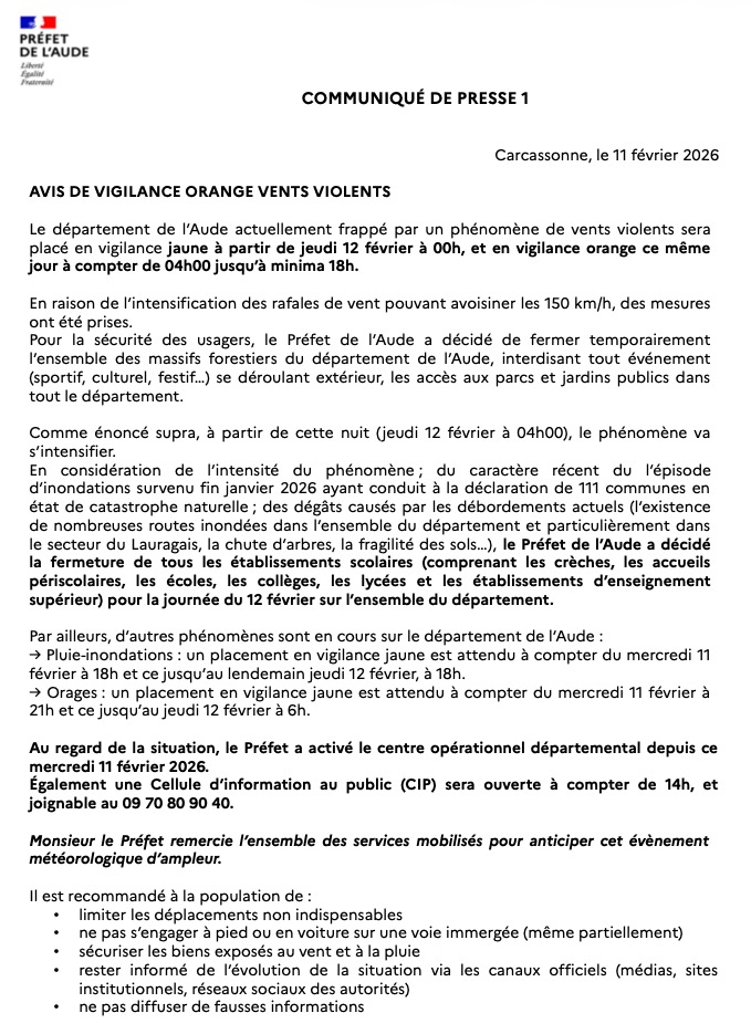 En raison de prévisions météo annonçant des vents tempétueux (rafales pouvant dépasser 150 km/h), le préfet de l’Aude a pris les mesures suivantes : Interdiction d’accès : Tous les massifs forestiers du département sont fermés au public (routes, pi...
