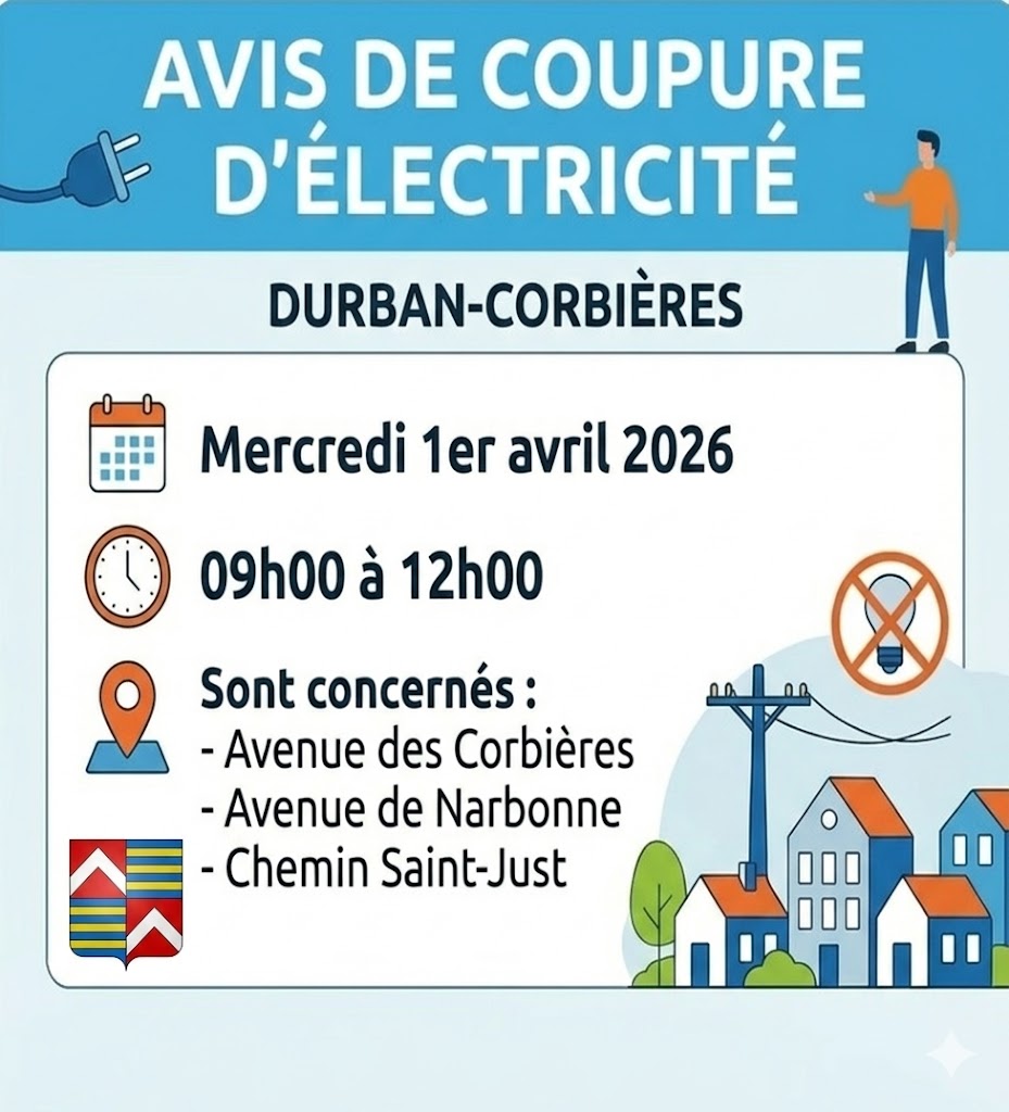 La mairie vous informe qu’Enedis va réaliser des travaux sur le réseau électrique afin d’améliorer la qualité de la distribution. Ces interventions entraîneront une interruption de service Le mercredi 1er avril 2026. de 09h00 à 12h00. Sont concernés ...