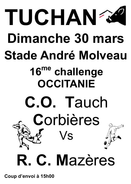 TuchanDimanche 30 mars 2025, le COTC organise un repas d'avant match suivi du 16me challenge Occitanie COTC contre Mazère au Stade André MOLVEAU à Tuchan.