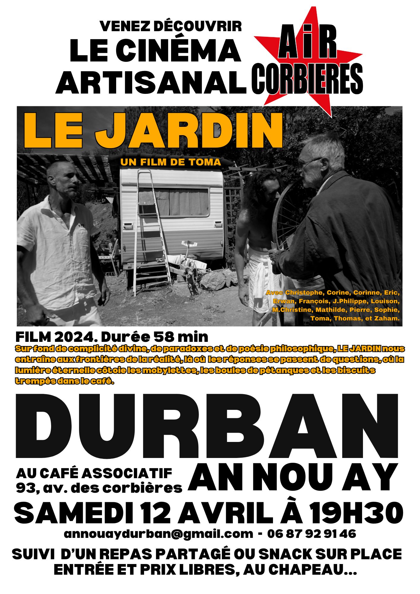 Café associatif An Nou Ay DURBAN-CORBIERESPour la première fois au café associatif An Nou Ay DURBAN, TOMA nous présentera son film "Le Jardin". la projection aura lieu le samedi 12 avril, à partir de 19h30. Entrée libre, au chapeau. Repas tiré du sac et petite restauration prévue sur place. Vous pouvez aussi commander votre plat en cuisine créole.