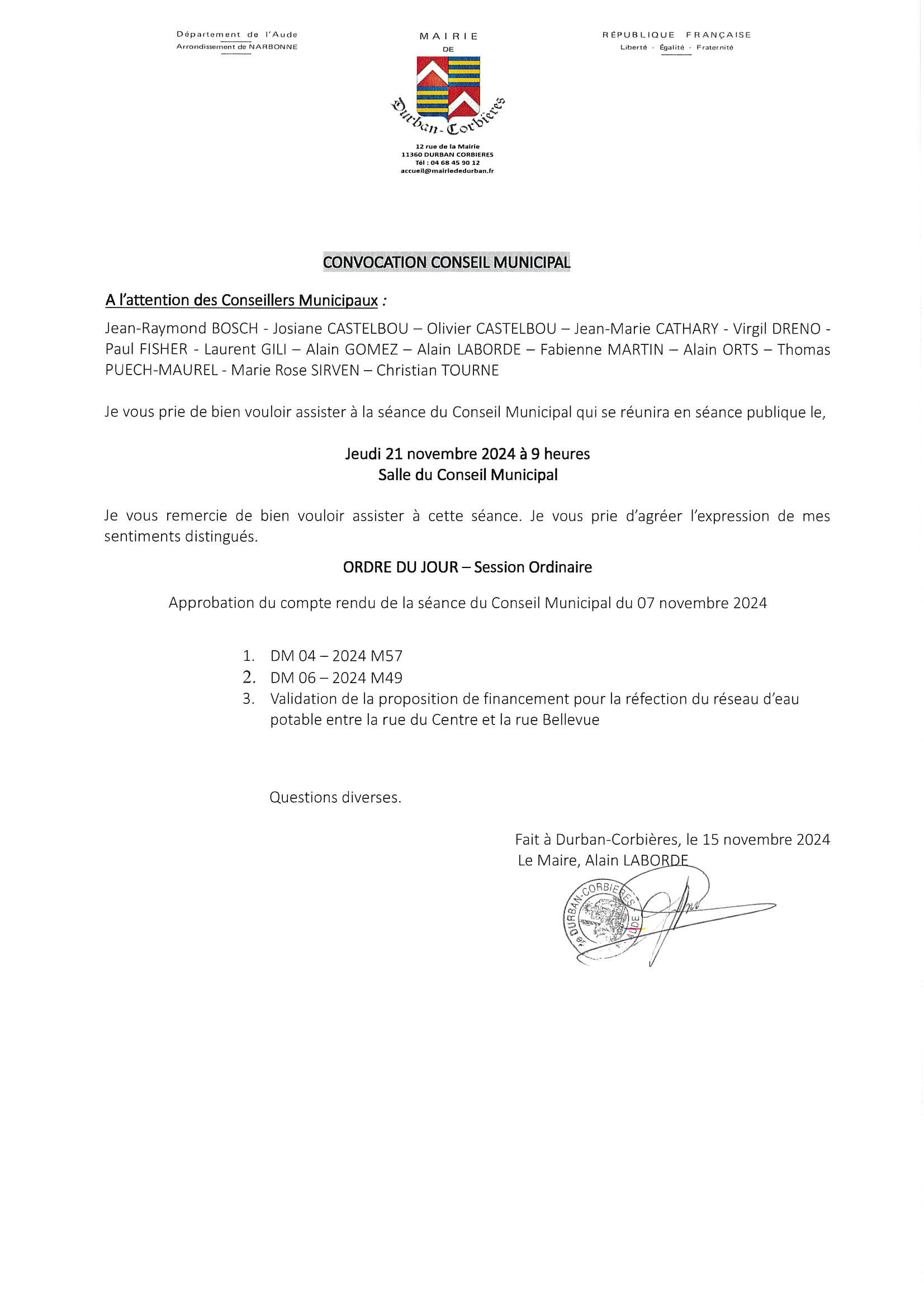 Salle du Conseil MunicipalCONSEIL MUNICIPAL - - - - - - - Le prochain Conseil Municipal aura lieu : mardi 10 décembre 2024 à 9 heures Salle du Conseil Municipal