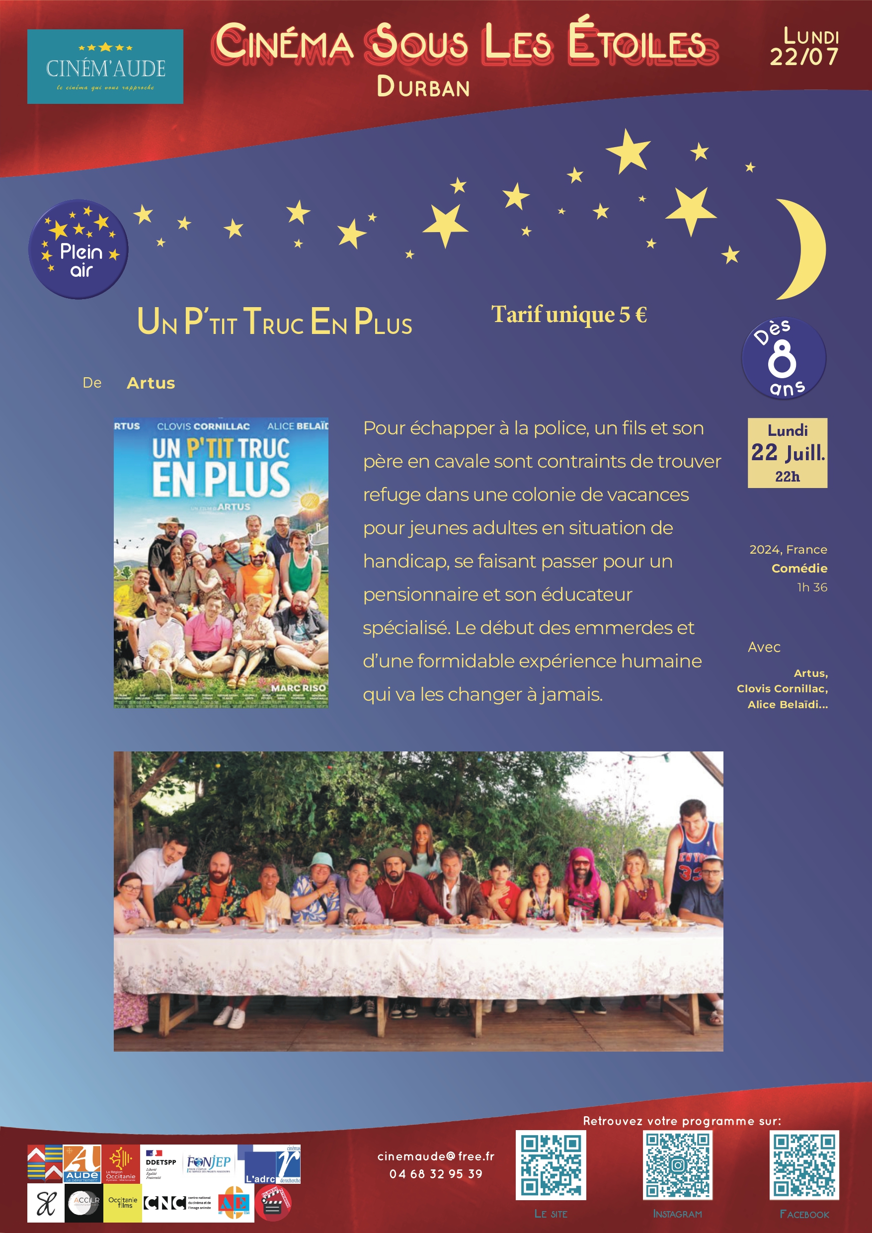 En raison de la météo, la séance prévue sur la place du marché est déplacée dans LA COUR DE LA MAIRIE. Lundi 22 juillet à 22h "Un p'tit truc en plus"