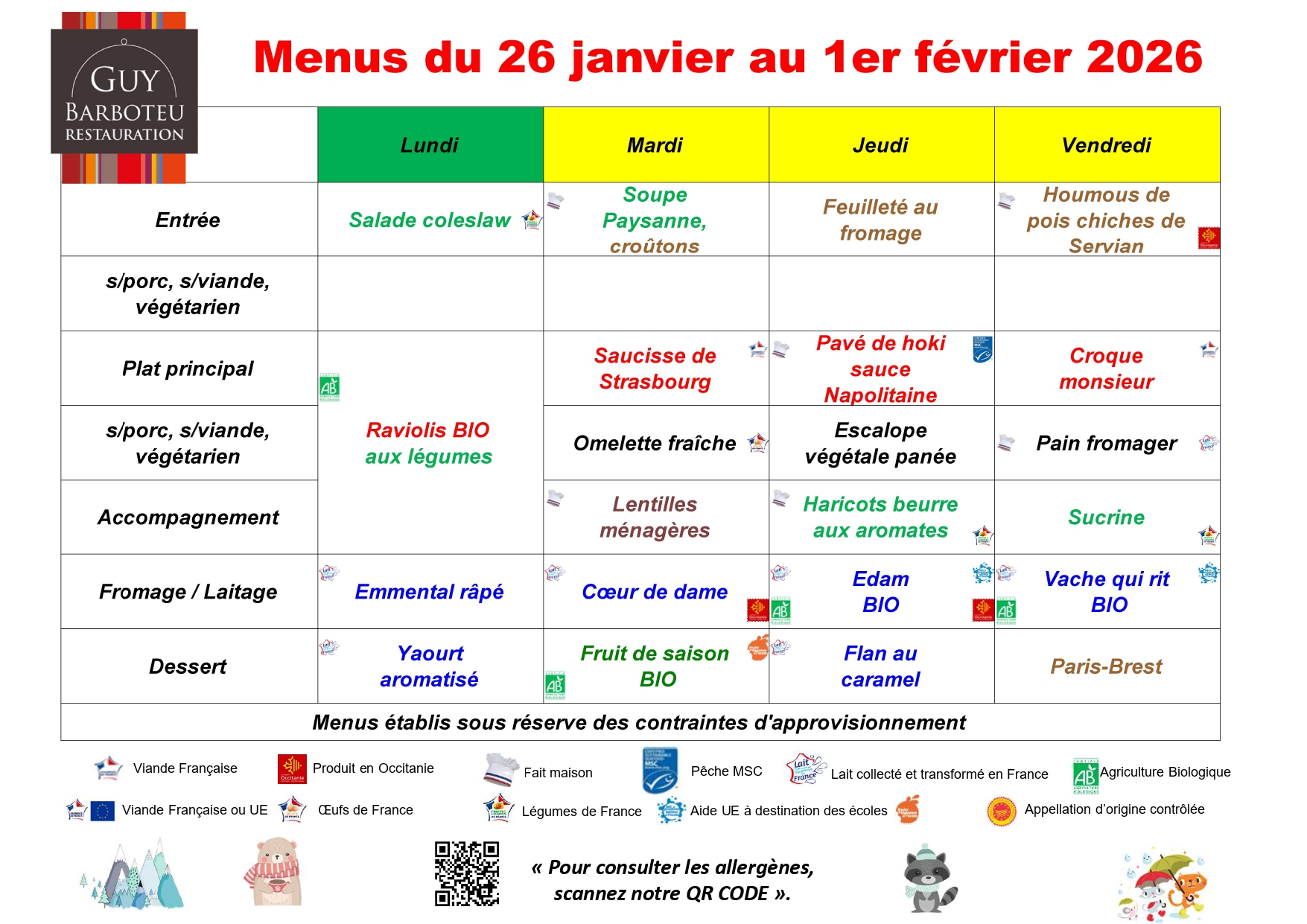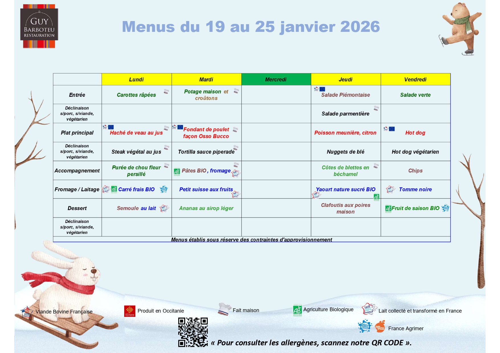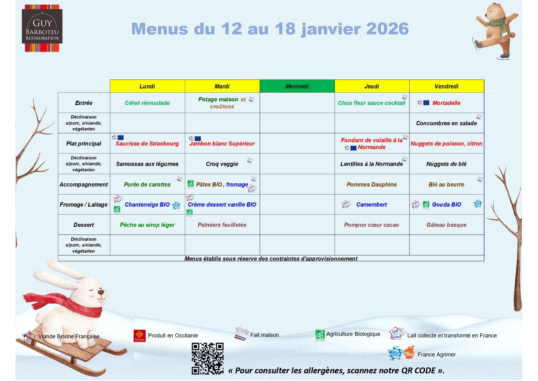 Information importante : La réservation ou l’annulation doit se faire au plus tard le lundi avant 12h pour la semaine suivante. Les repas non pris ne seront pas remboursés.